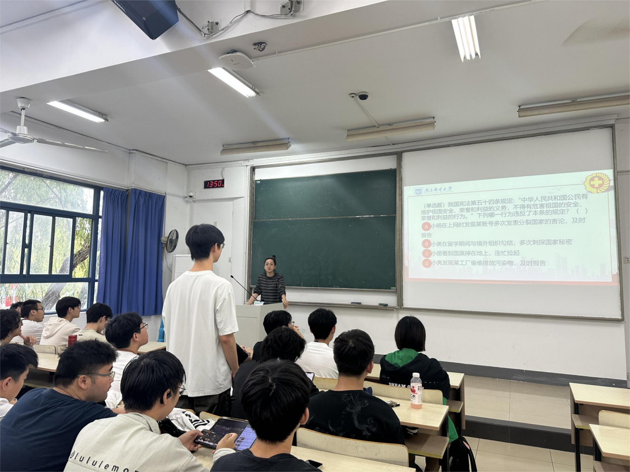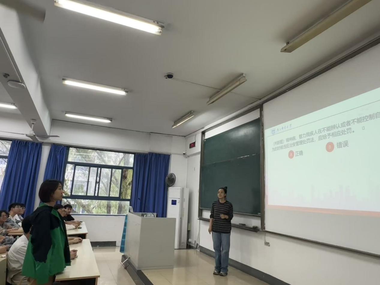 随后,进入法治宣传教育学习环节。陶乐行老师系统解读了新颁布的《法治宣传教育法》的立法背景、主要内容和重要意义,并对比讲解了新修订的《治安管理处罚法》的亮点,特别是关于未成年人违法处理、网络谣言治理等与学生群体密切相关的最新规定,通过以案释法强调了自觉守法的重要性。同时,通过知识竞答的形式激发学生学习热情,选取学生喜闻乐见的方式来增强她他们对法治的了解。