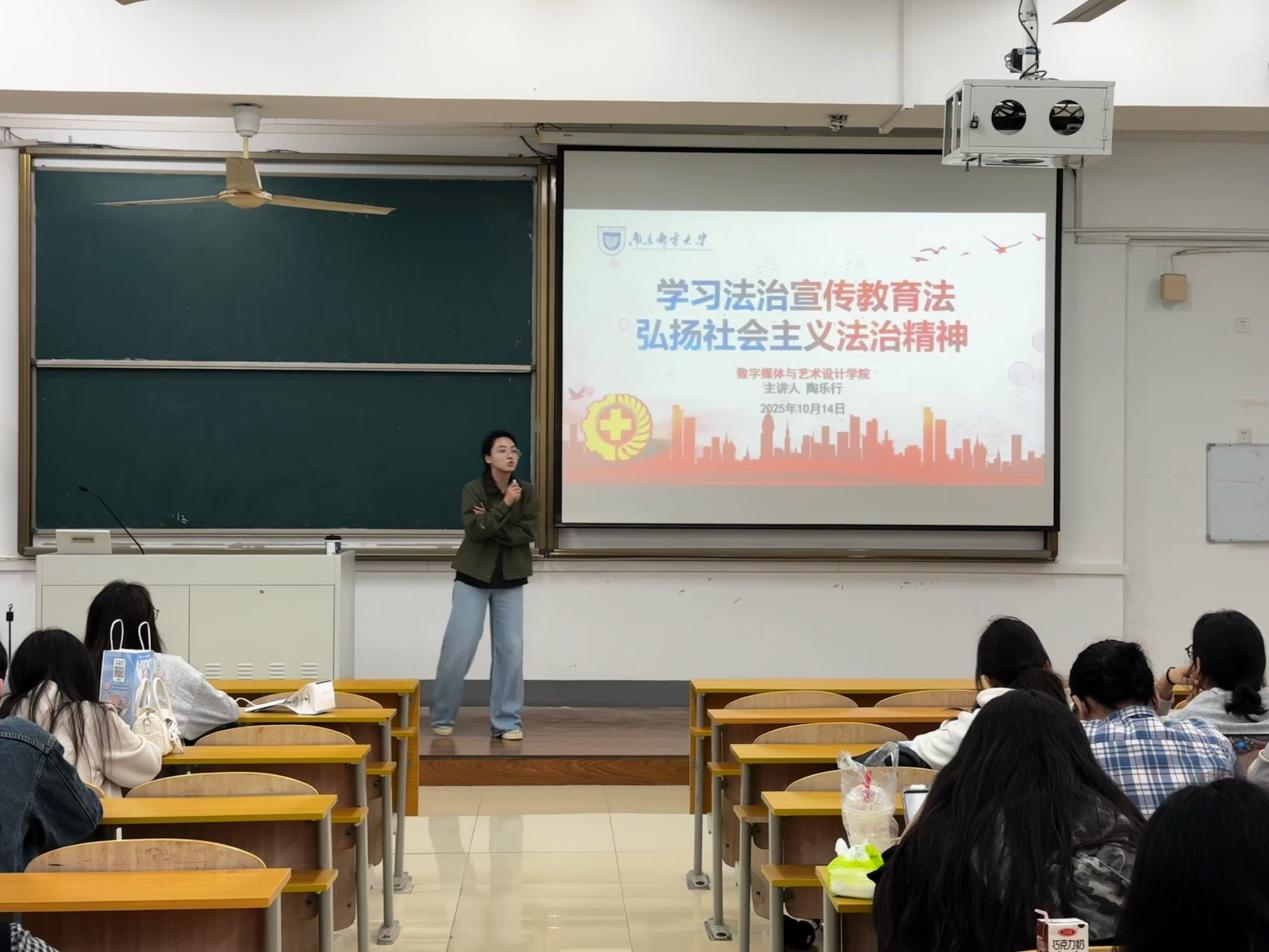 为深入学习贯彻习近平法治思想,落实立德树人根本任务,数字媒体与艺术设计学院于2025年10月14日组织2023级全体学生开展主题宣传教育活动。活动围绕“树立正确宗教观”和“学习法治宣传教育法,弘扬社会主义法治精神”展开。辅导员陶乐行首先强调,根据《普通高等学校学生管理规定》第四十三条规定:学校应当坚持教育与宗教相分离原则,任何组织和个人不得在学校进行宗教活动,引导学生科学理性看待宗教,自觉抵制非法宗教活动,树立正确宗教观。