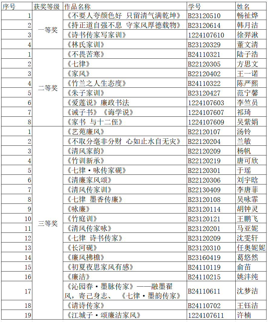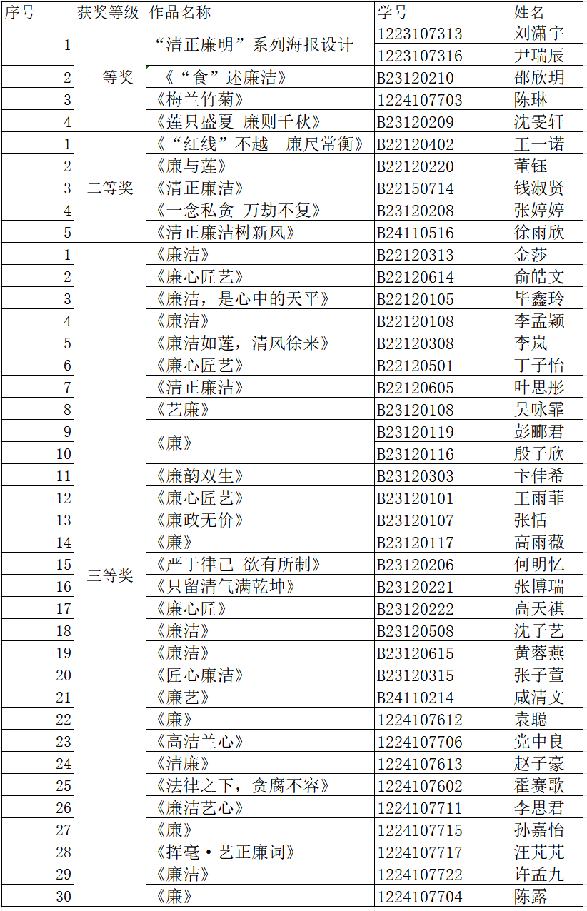 经过专业评审团的认真评选,最终在廉洁主题设计作品中评选出一等奖4名、二等奖5名、三等奖若干名,在廉洁家风诗词中评选出一等奖4名、二等奖8名、三等奖若干名。这些作品主题鲜明、形式多样、立意深刻,充分展现了我院学子崇廉尚洁的价值追求和扎实的专业素养。