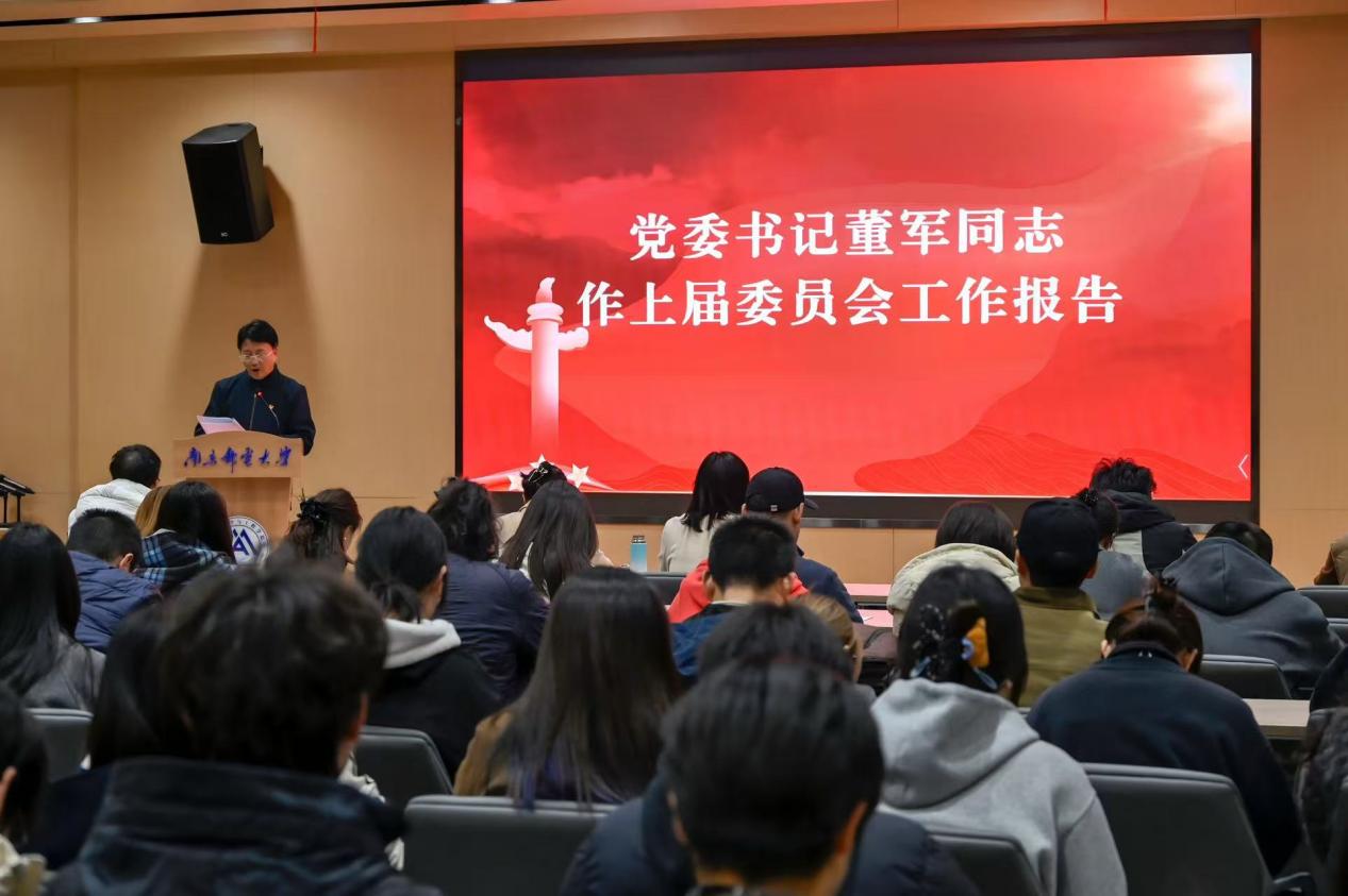 学院党委书记董军同志代表上一届党委向大会作题为《凝心聚力绘蓝图 砥砺奋进启新程》的工作报告。报告系统回顾了过去五年学院党的建设和事业发展取得的成就,明确了未来五年将坚持以高质量党建为引领,紧紧围绕“科技+艺术+文化”融合发展战略,在强化政治引领、深化铸魂育人、推动学科交叉融合、加强高水平人才引育、夯实基层组织建设等方面持续发力,奋力打造数字媒体领域创新高地的总体方向与重点任务。报告强调,必须始终坚持党的全面领导、坚守立德树人根本任务与特色发展路径,传承南邮红色基因、发挥交叉学科优势,以更加昂扬的斗志、更加务实的作风引领学院各项事业实现新发展、再上新台阶。