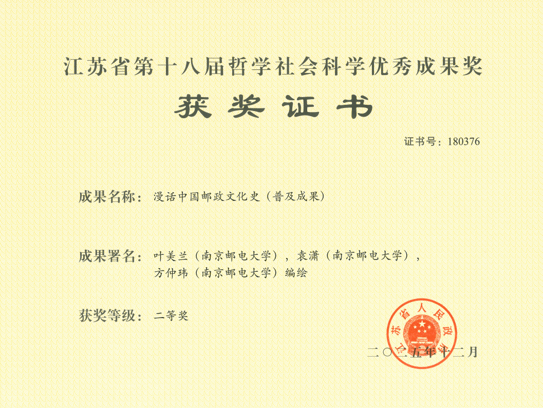 《漫话中国邮政文化史》由我校校长叶美兰教授及袁潇教授主笔,方仲玮副教授编绘。成果在系统梳理邮政文化历史事件和有关文化知识的基础上,通过有情节的小故事,结合中国古诗词,以漫画的形式生动展示悠久邮政文化;成果还对“烽火戏诸侯”等相关史实进行了重新审视,将战邮精神深刻融入至邮政文化史之中,兼具文化价值与科普价值。据悉,该成果于今年1月荣获江苏省文化产业学会优秀成果奖一等奖。
