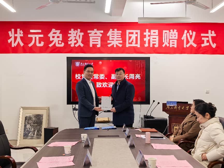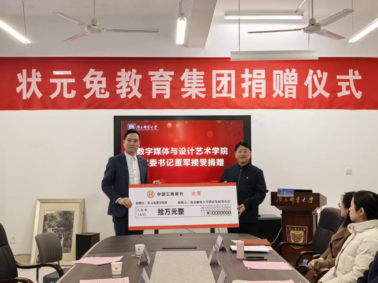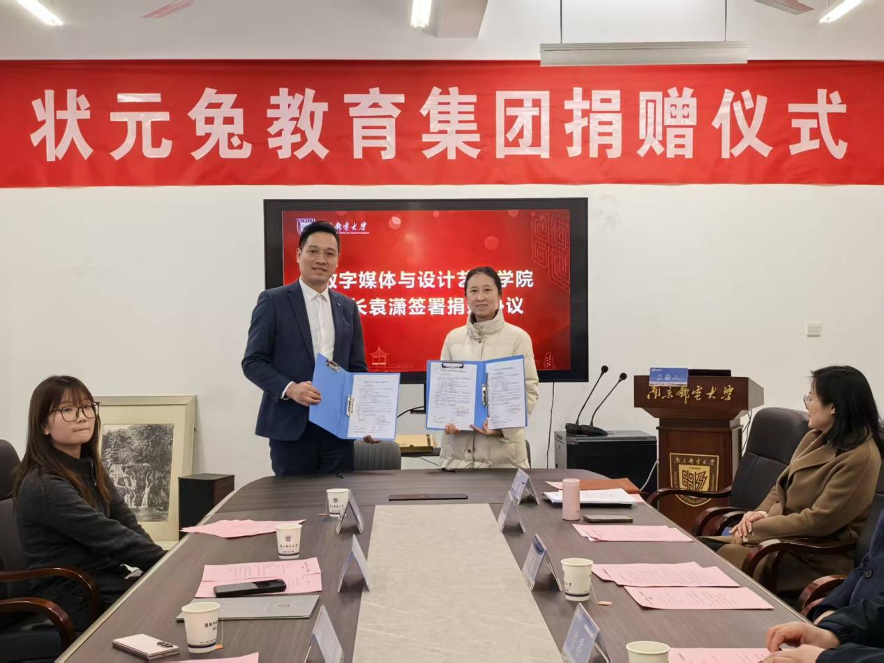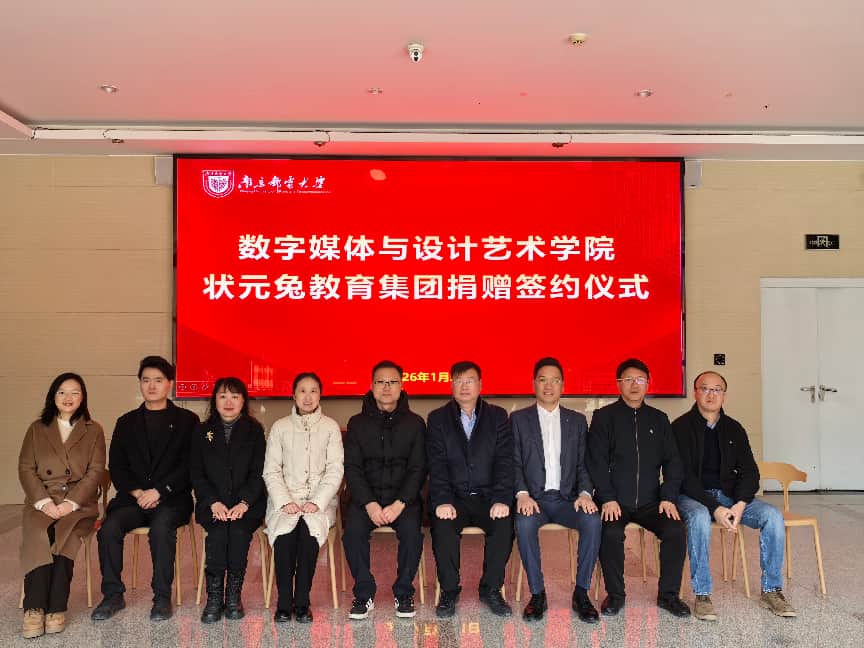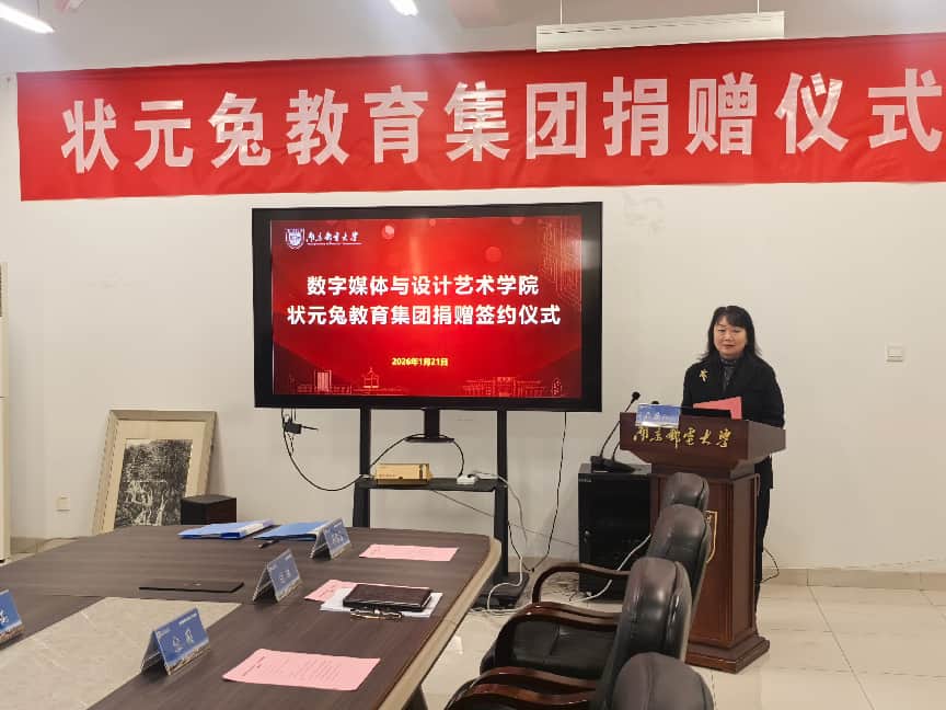2026年1月21日下午14:30,南京邮电大学数字媒体与设计艺术学院在仙林校区文科楼120会议室隆重举行“状元兔教育集团”捐赠签约仪式。“状元兔教育集团”捐赠10万元用于支持数字媒体与设计艺术学院教育事业和学生发展。南京邮电大学党委常委、副校长周亮等出席仪式并致辞,状元兔教育集团江苏总经理陆瑾瑜、南京邮电大学对外联络处副处长王楷、数字媒体与设计艺术学院院长袁潇、党委书记董军、副院长华维慧等相关负责人及师生代表参加了仪式。仪式由数字媒体与设计艺术学院党委副书记、副院长刘远主持。