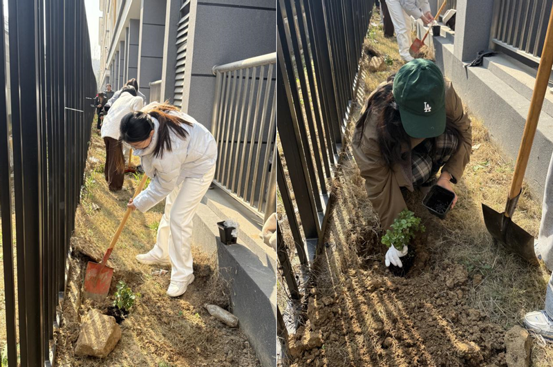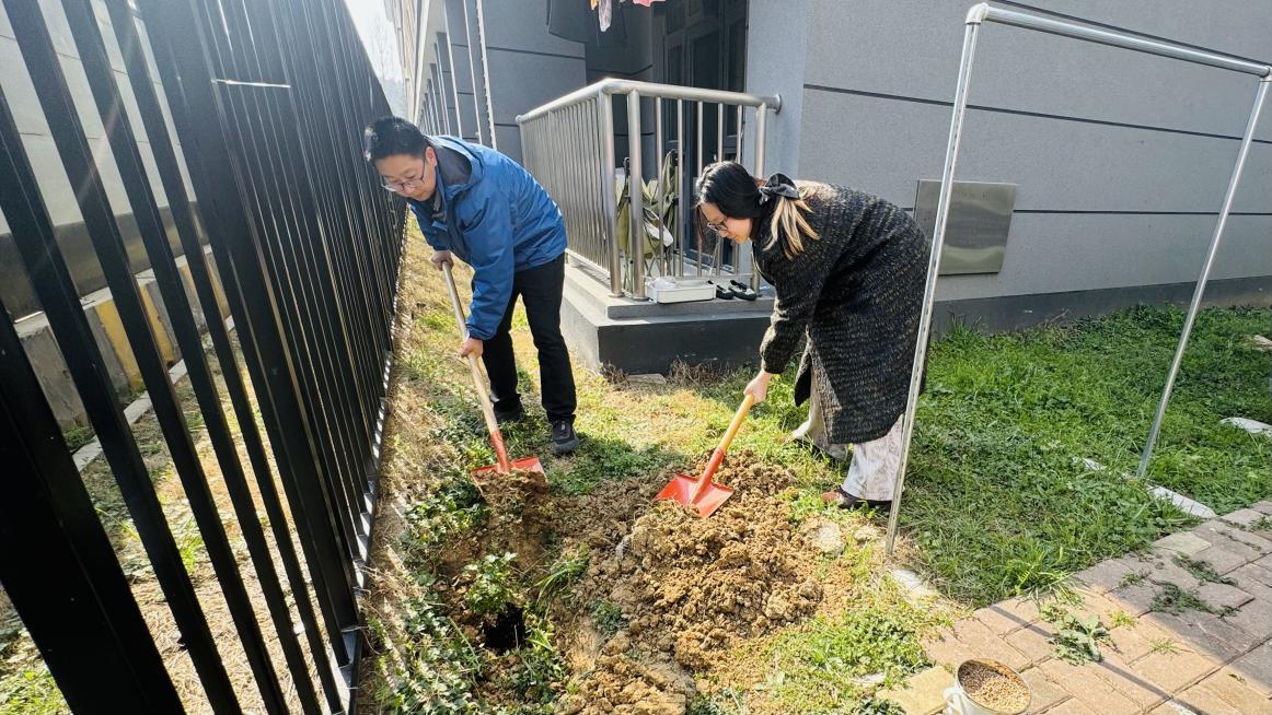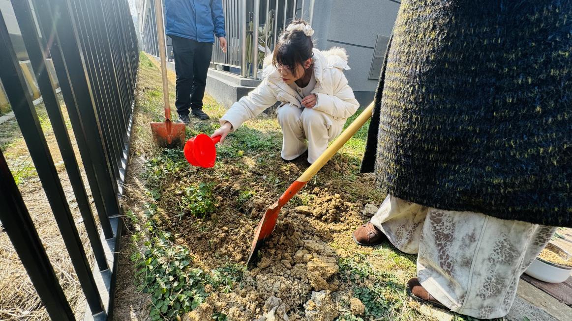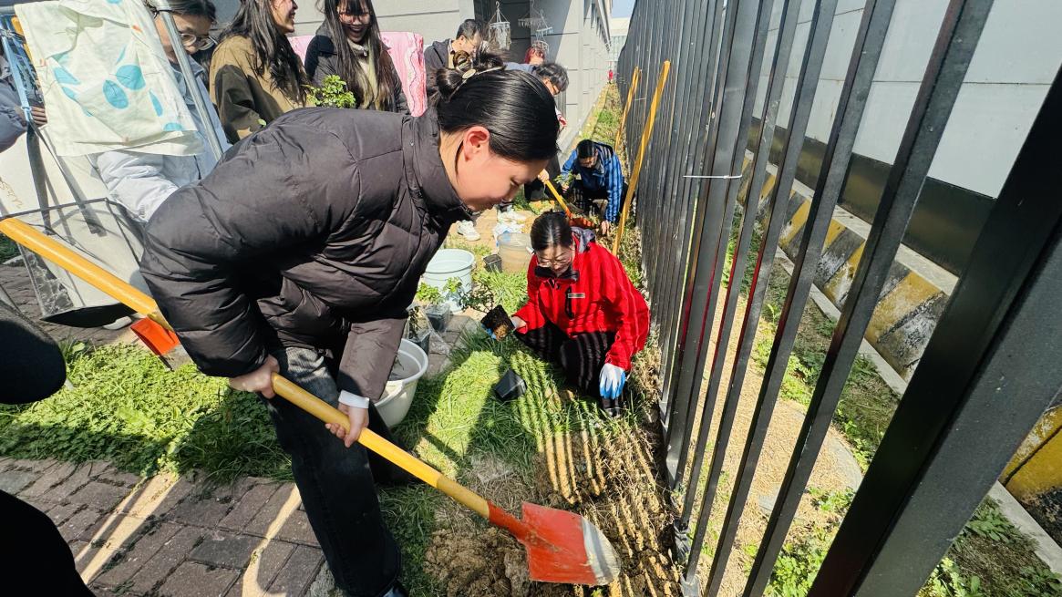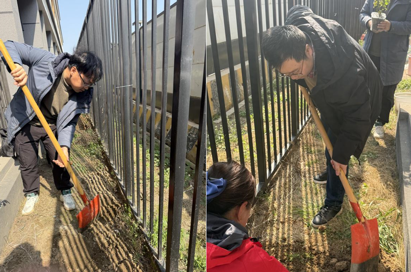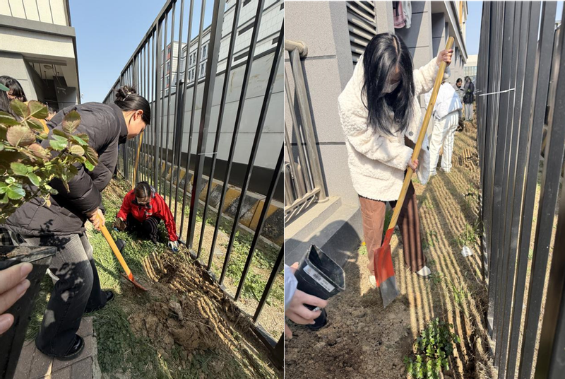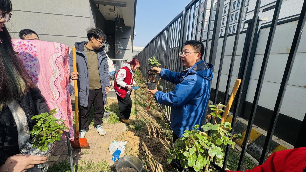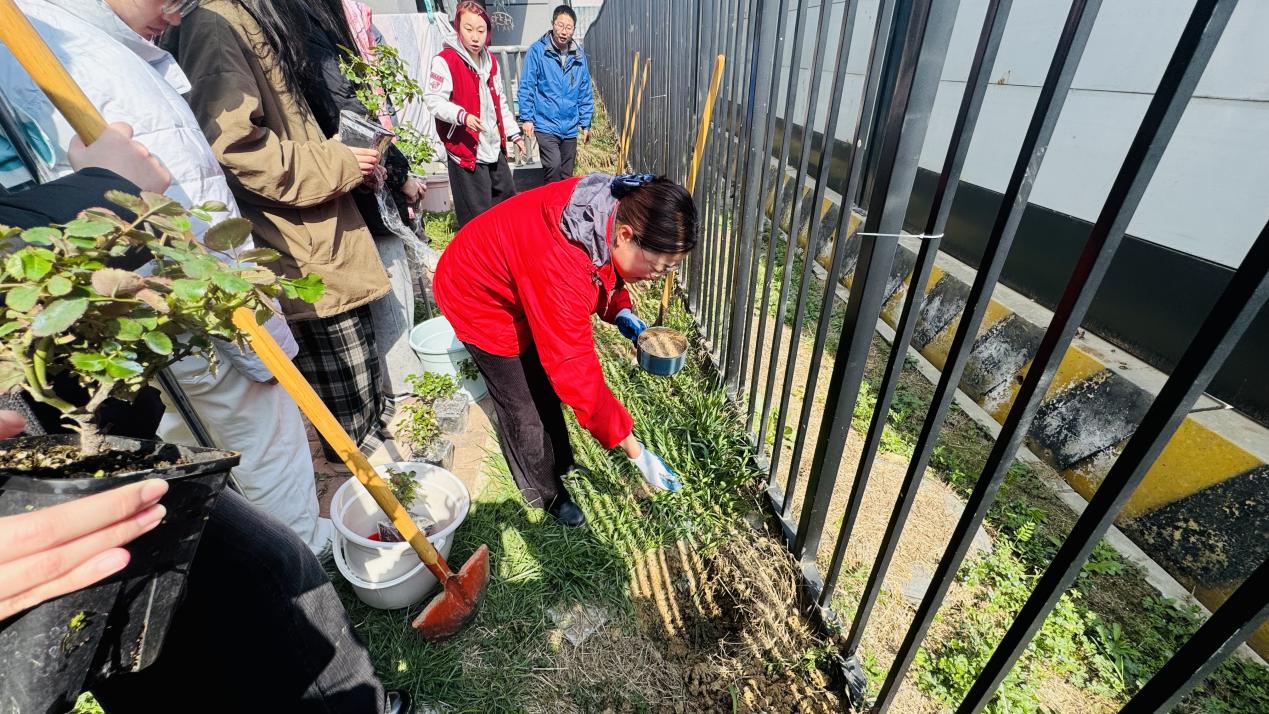 师生们热情高涨,手持铁锹、水桶等工具,分工协作、默契配合:有的俯身松土,有的扶苗定根,有的提水浇灌,原本空旷的栏杆旁,一株株蔷薇幼苗在大家的悉心照料下稳稳扎根。