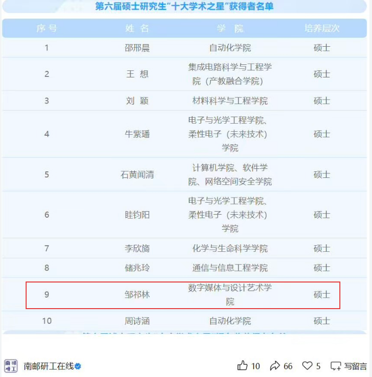 近日,南京邮电大学第六届研究生“十大学术之星”评选结果正式揭晓,数字媒体与设计艺术学院2023级新闻与传播专业硕士研究生邹祁林凭借扎实的学术功底、积极的探究精神和突出的学业表现,荣获该荣誉称号,是文科学院唯一获此殊荣的学生。