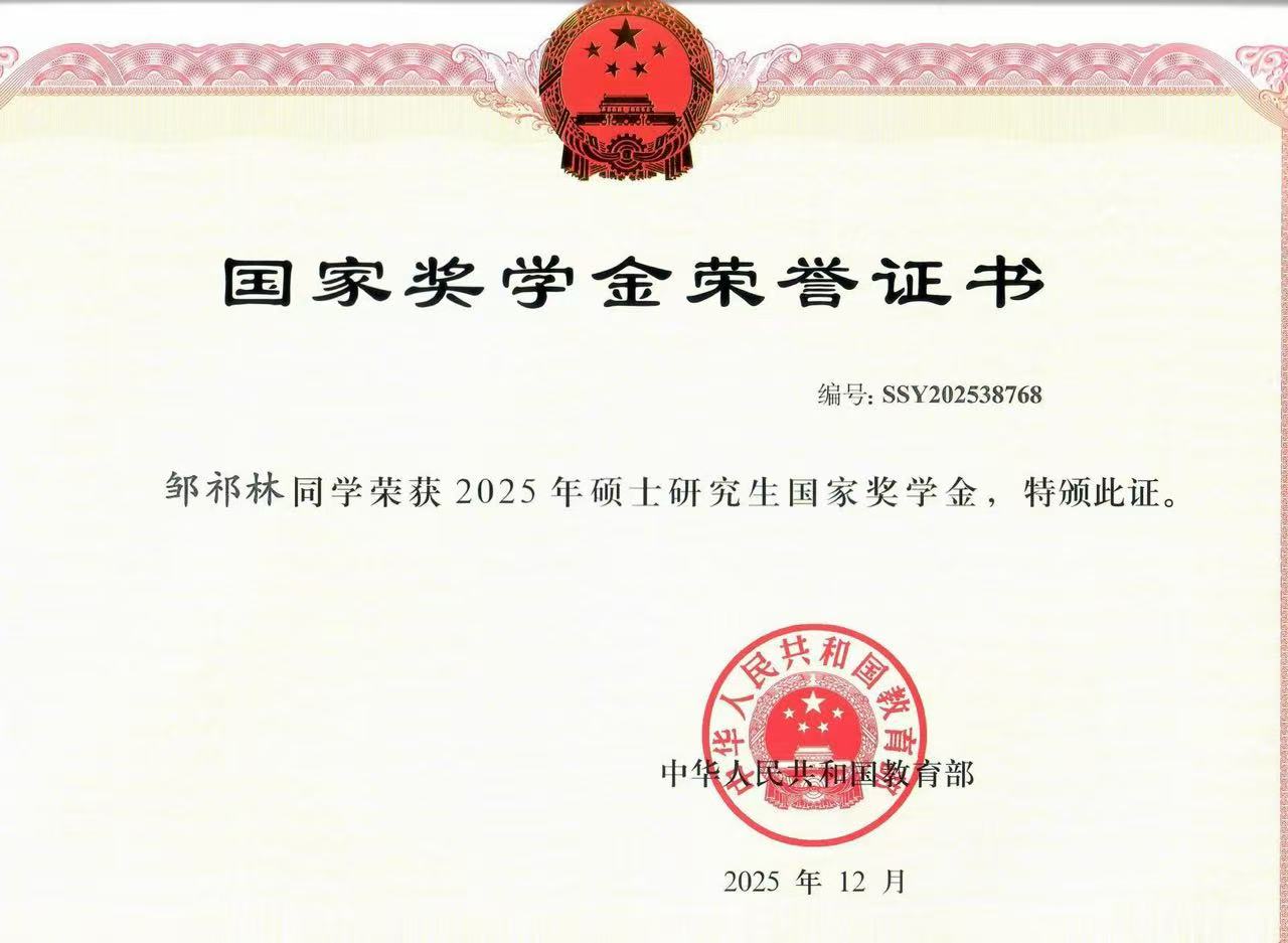 自入学以来,邹祁林同学始终将科研工作与学习放在首位,严谨认真,勤奋刻苦,始终保持积极进取的学习态度。课堂上,他专注听讲、勤于思考,主动与老师、同学交流学术观点;课后,他合理安排时间,广泛查阅学术资料,深耕专业知识,不断夯实自身学术基础。在专业学习中,他始终保持优异的成绩,获得硕士研究生国家奖学金、“优秀研究生标兵”称号、一等学业奖学金等荣誉,展现出较强的自主学习能力和学术领悟能力。