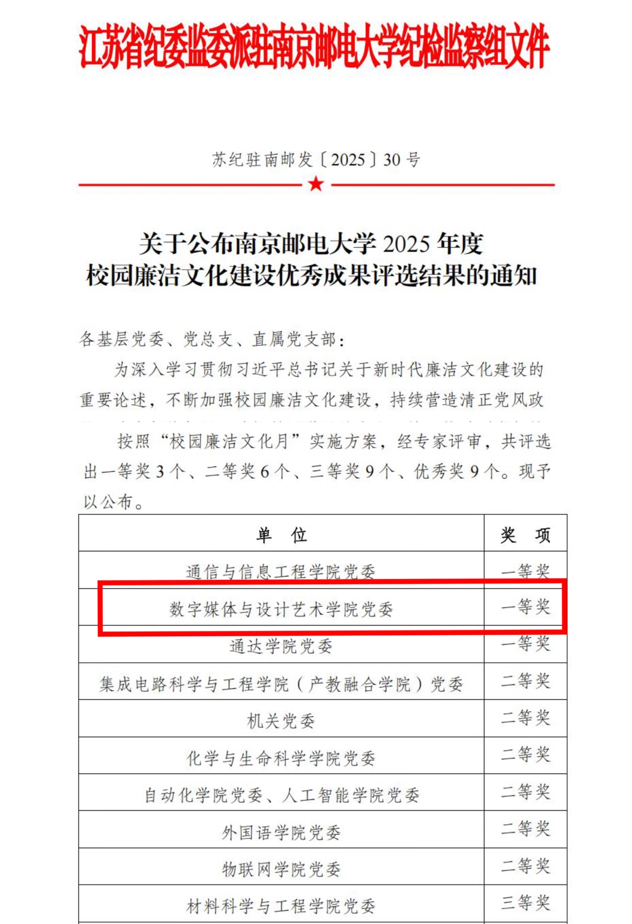 近日,南京邮电大学2025年度校园廉洁文化建设优秀成果评选结果揭晓,学院党委“‘艺’正‘廉’词画初心,‘媒’开再度展风华”主题系列廉洁教育活动,凭借创新实践与显著成效,荣获一等奖。