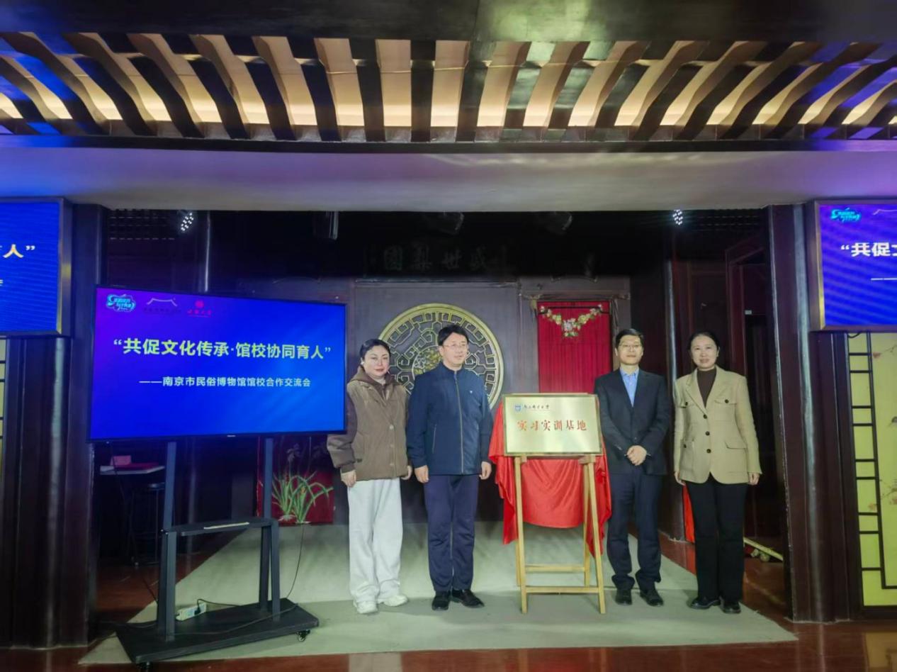 签约仪式上,数字媒体与设计艺术学院院长袁潇与南京民俗博物馆馆长黄贵成正式签署校企合作协议,党委书记董军为实习实践基地揭牌。根据协议,学院与博物馆将共建实践教学基地,围绕非遗数字化保护、文创产品研发等领域开展深度合作,通过产学研融合创新,实现文化传承与人才培养的有机结合。