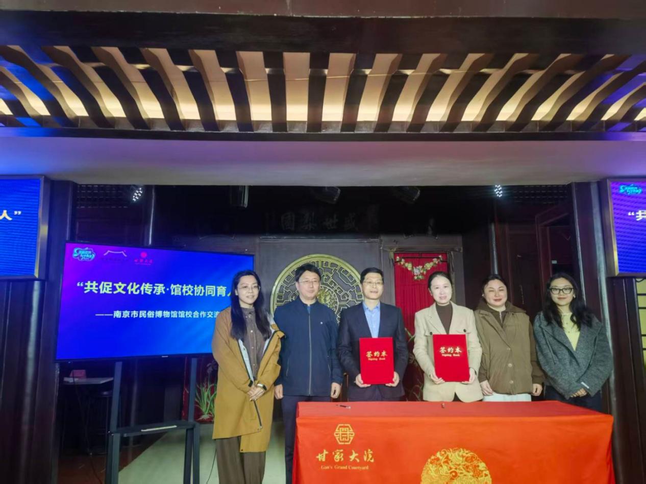 2025年11月27日,以"共促文化传承·馆校协同育人"为主题的校企合作签约仪式在南京民俗博物馆隆重举行。数字媒体与设计艺术学院党委书记董军,院长袁潇,谭维老师,辅导员陶乐行、李雅平等参加活动。